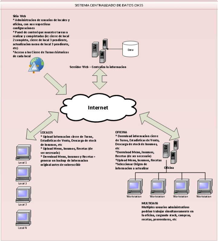 Los Sistemas OASS en la Oficina Central son completamente independientes, uno los ve como si estuviera físicamente en el Local correspondiente. Toda la carga administrativa se realiza en la Oficina. El Local solo vende, genera el Cierre de Turno, saca Estadísticas y descarga de stock por las recetas de los platos vendidos.